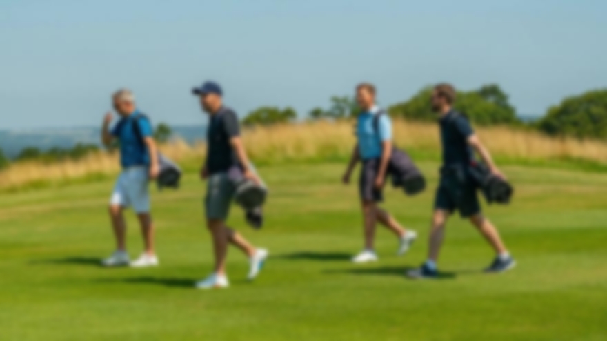 Golfers walking across the course.