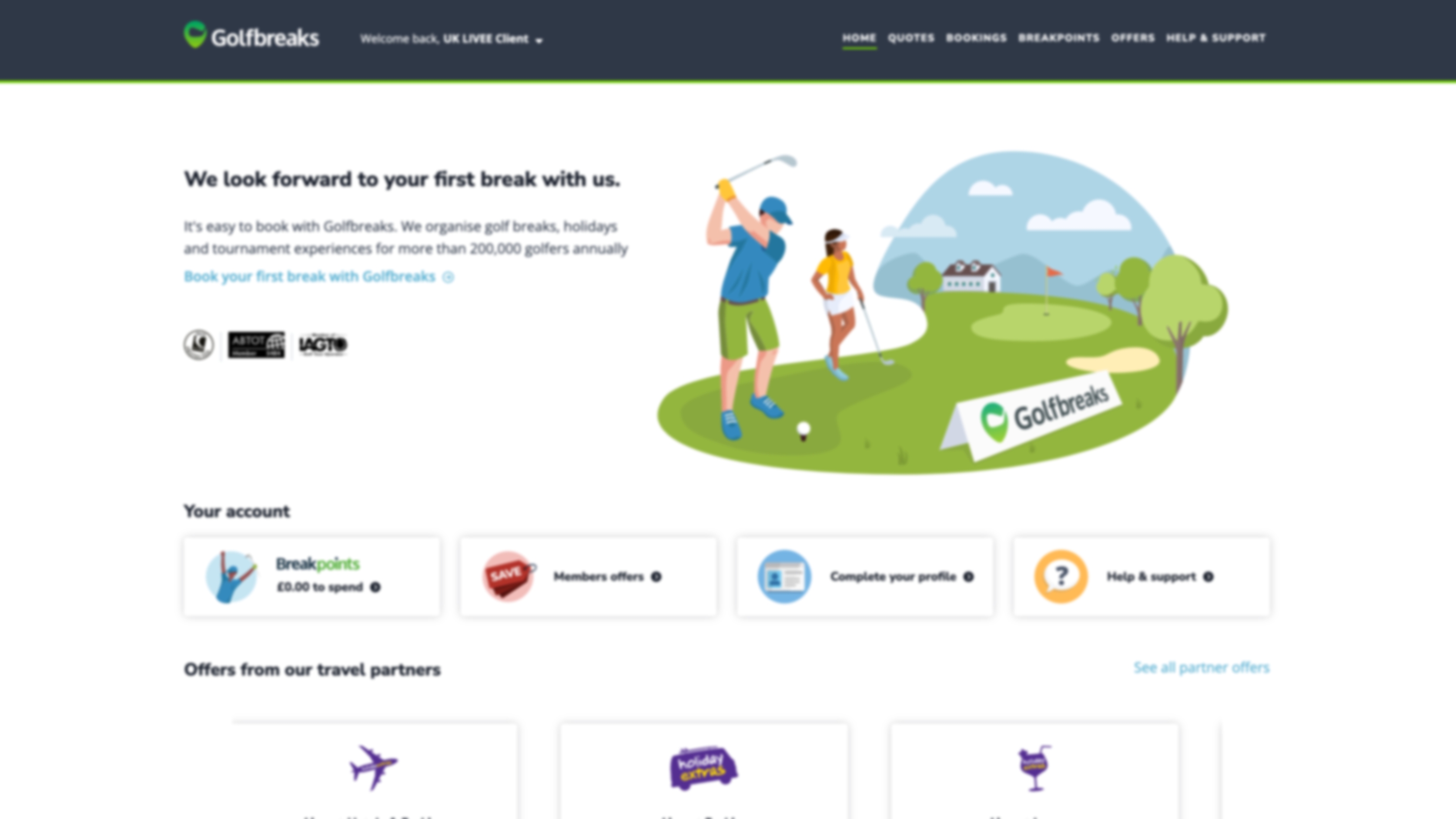 Once signed in, you will be viewing the portal dashboard. This area will provide you with easy access to any quotes or bookings and a list of the latest Golfbreaks promotions. You can also quickly navigate to view your Breakpoints, member offers, and your account settings where you can update your profile.