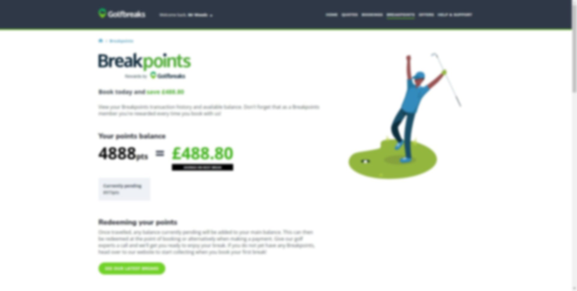 This is our loyalty programme, where you can earn points for every pound spent and redeem them for money off future golf breaks. Your portal will show you any current points you have banked and what that converts to in savings, as well as any pending Breakpoints for upcoming bookings.