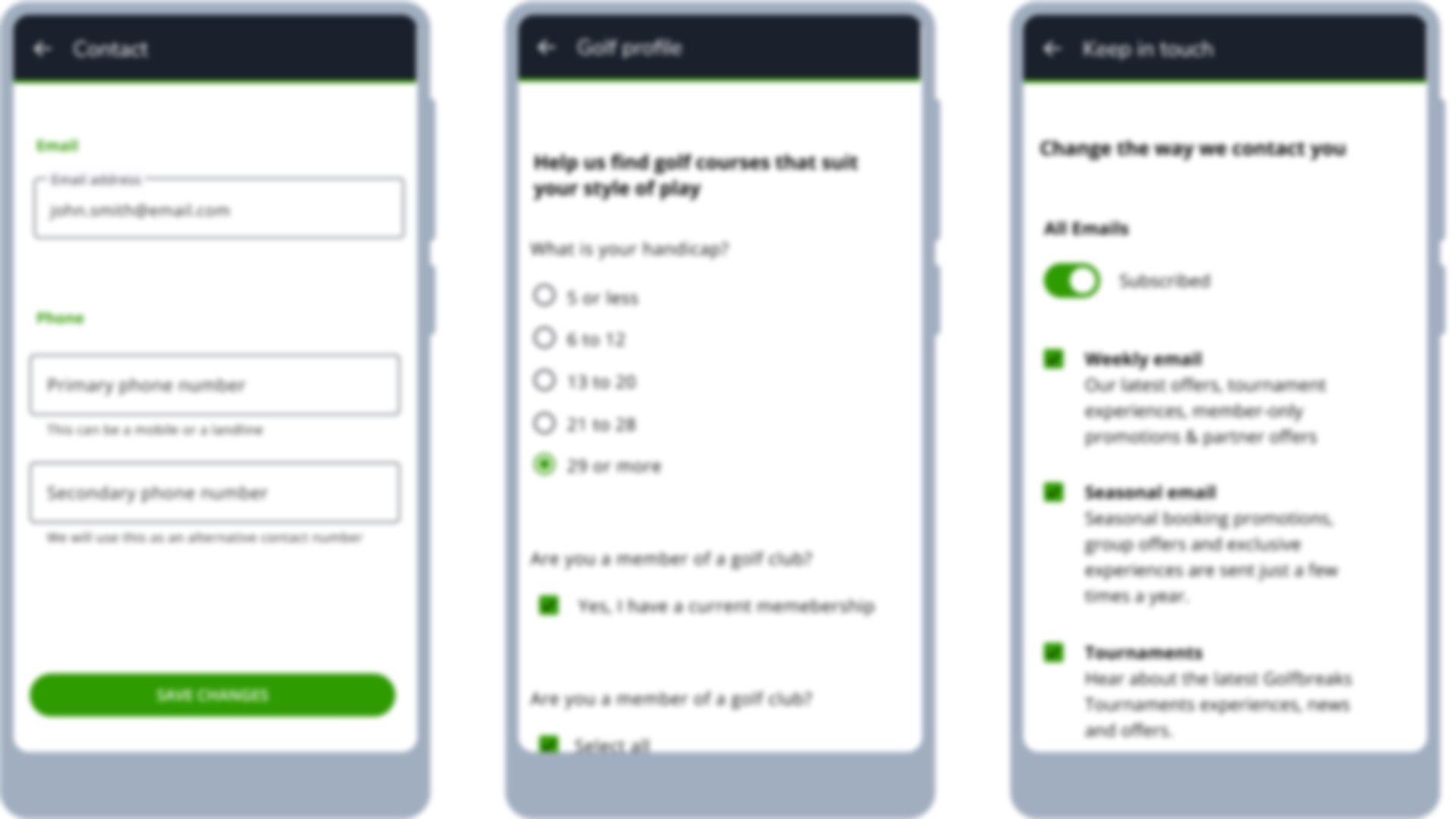 Here you can ensure your personal details are up-to-date and tell us more about your golf and travel preferences. This will personalize your experience and ensure that we show you the most relevant offers and information. The account page is also where you can choose how Golfbreaks keeps in touch with you, with the option of subscribing to our weekly email, seasonal brochure, and SMS offers.
