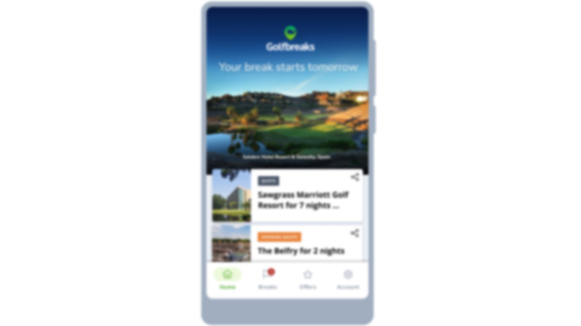 Once signed in, you will be viewing your app homepage. This area will provide you with easy access to any quotes or bookings and a list of the latest Golfbreaks offers. You can also quickly navigate to view your member offers and your account settings where you can update your profile.