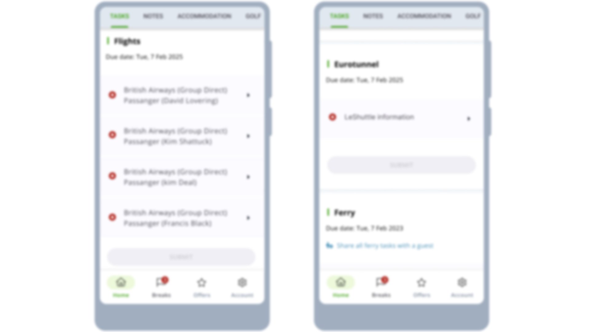 - Tasks: The tasks section is where the Lead Booker can provide or allocate information that needs to be collected before you depart for your golf trip. For example, Advanced Passenger Information (API) for flights, car details for travelling on ferries, flight details for airport transfers, and more. Please be aware that depending on how you are travelling, and the company you are travelling with, different information will be required from you and all your guests. It is important that you correctly provide this information to prevent any issues or delays with your booking.
