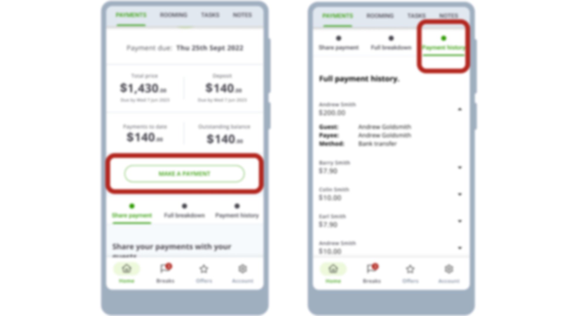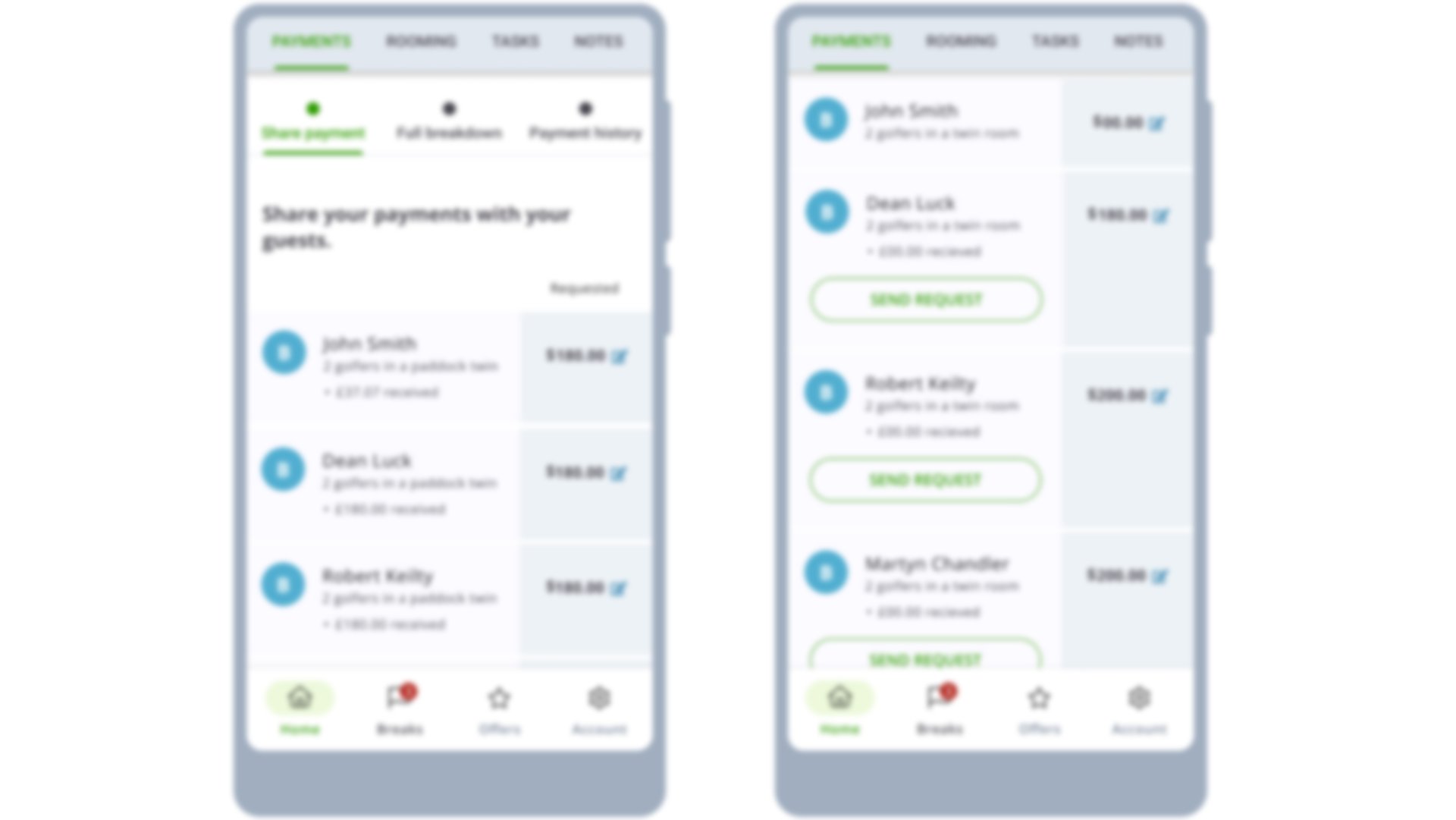 The ‘pay’ button is unique to the lead booker (if set when managing guests). If you have submitted a guest’s email in the ‘Manage guests’ tab, you will see a ‘request’ button when allocating a payment to them. If a guest does not want to provide their email, you can send them a payment link instead.