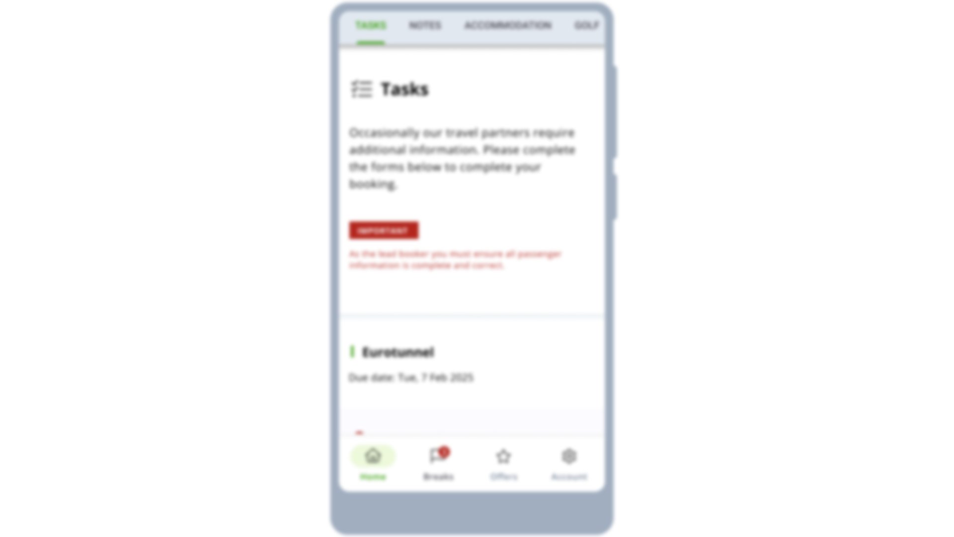 - Tasks: The tasks section is where the Lead Booker can provide or allocate information that needs to be collected before you depart for your golf trip. For example, Advanced Passenger Information (API) for flights, car details for travelling on ferries, flight details for airport transfers, and more. Please be aware that depending on how you are travelling, and the company you are travelling with, different information will be required from you and all your guests. It is important that you correctly provide this information to prevent any issues or delays with your booking.