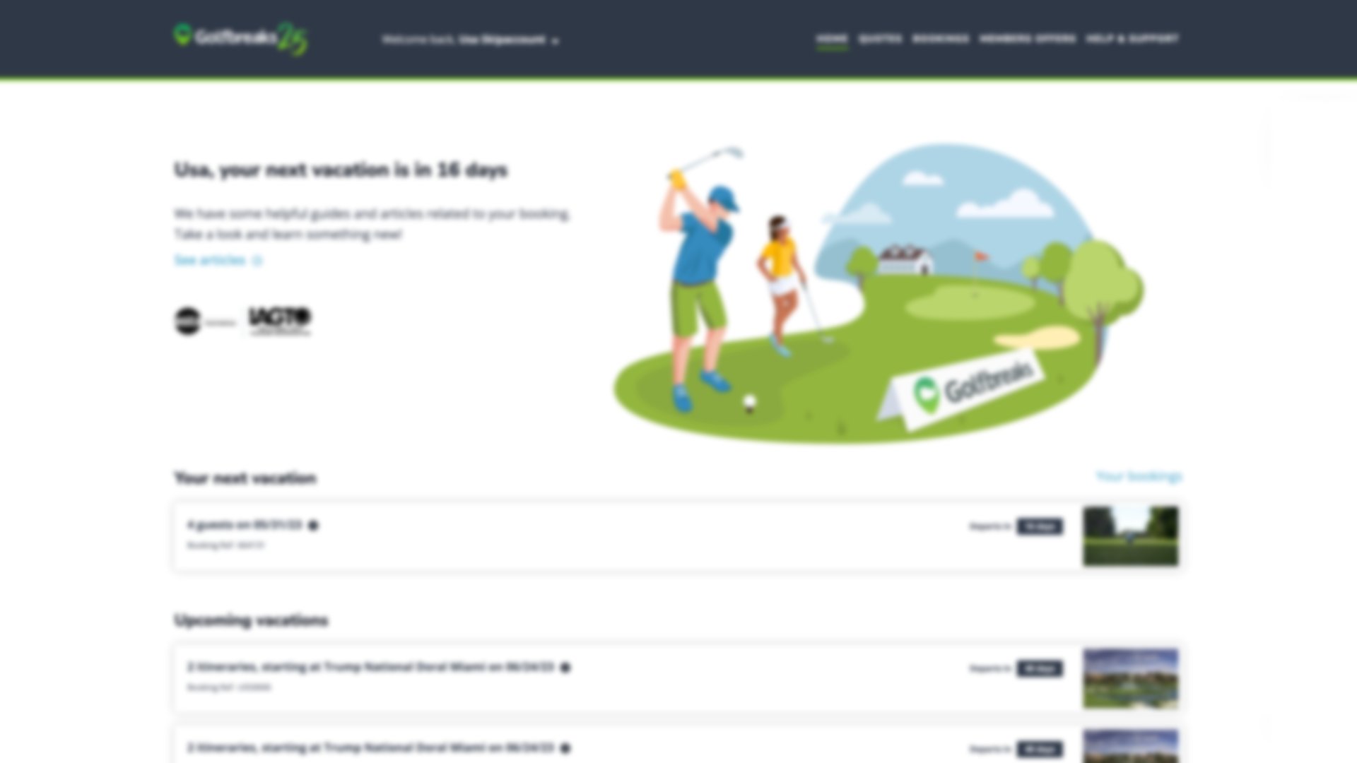 Once signed in, you will be viewing the portal dashboard. This area will provide you with easy access to any quotes or bookings and a list of the latest Golfbreaks promotions. You can also quickly navigate to view your member offers and your account settings where you can update your profile.