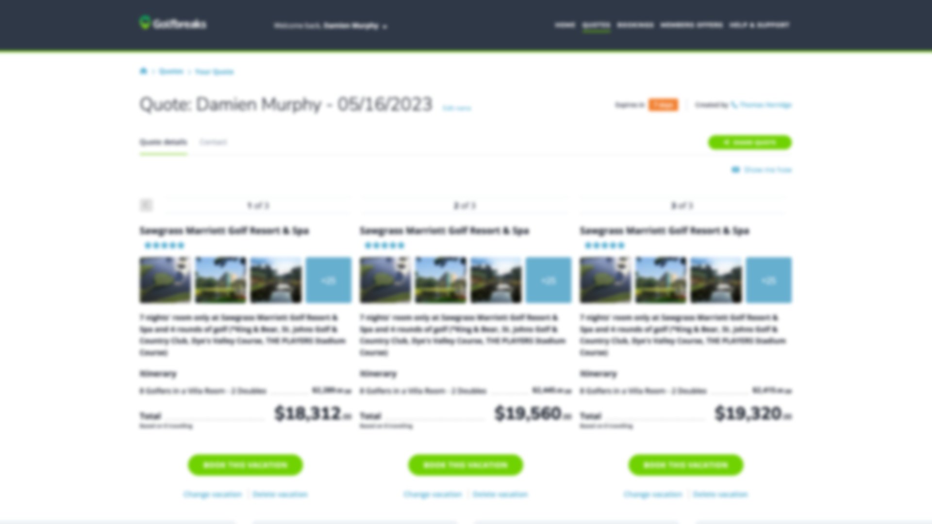 There will be a quote available for you to view online after you’ve inquired about a golf trip, with a price breakdown available for each itinerary. The online portal allows you to self-manage your quotes, with the option to delete a package, book a trip, and share the quote with other members of your group.
