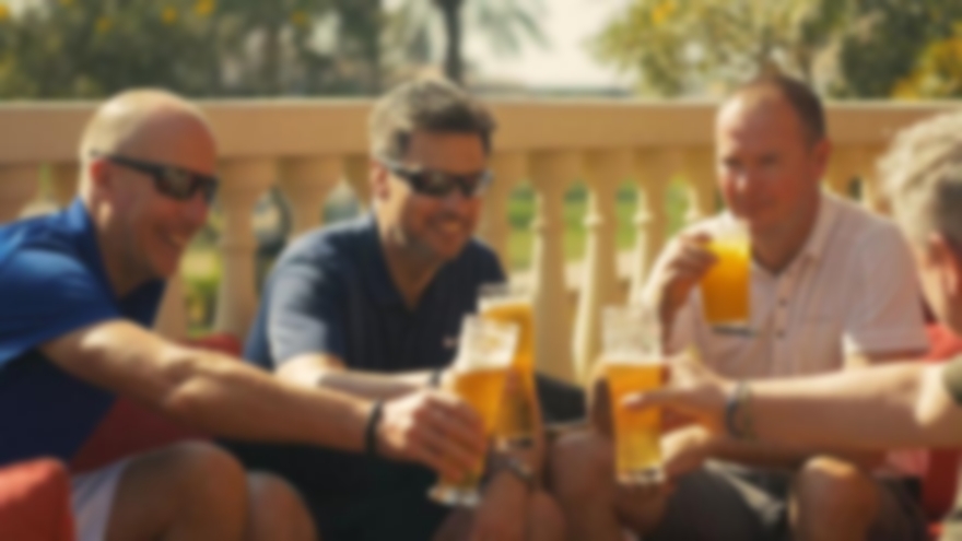 Golfers enjoying post-round drinks.