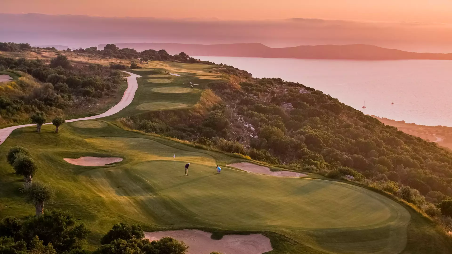 Golfers walking across the course.