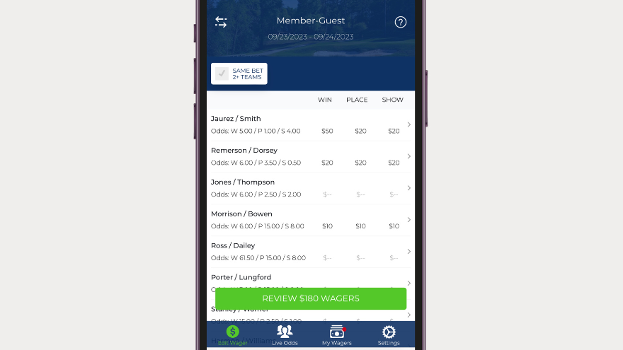 Homestretch Golf adds wagering excitement to group trips by allowing travelers to save wagers across many types of betting opportunities from any device while enjoying fluctuating live odds up until play starts! Trip admins can easily manage and track all the wagering tickets and generate stress-free payouts automatically calculated by Homestretch Golf upon checkout. Traditional Win (top 1), Place (top 2), and Show (top 3) wager types are available, however many different formats of play lend well to pari-mutuel style predictions and payouts: Overall trip winner, daily performances, prop bets like predicted winning score, flight winners, head-to-head matches and more!